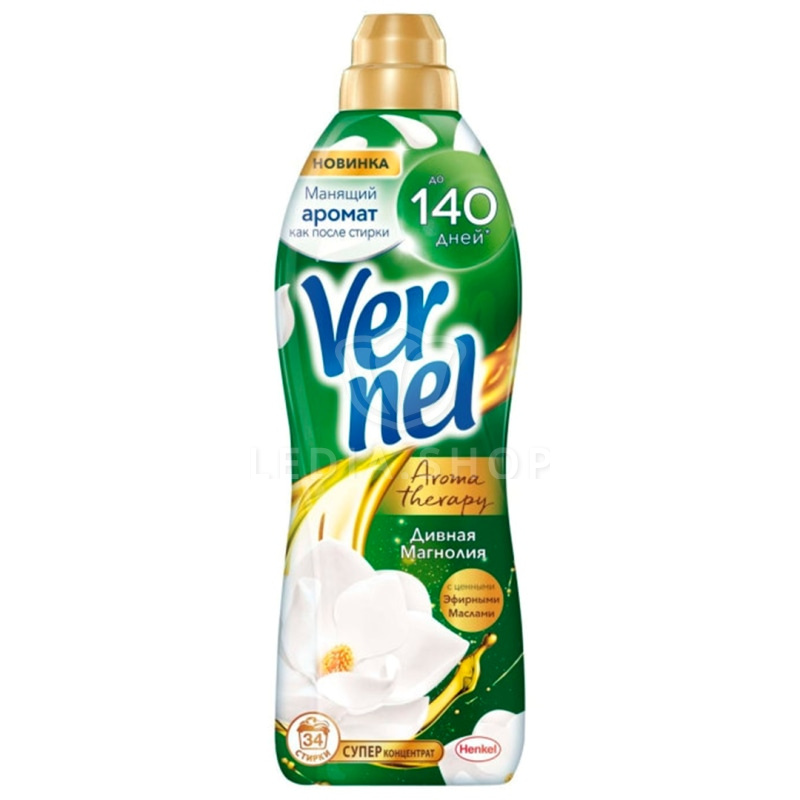 Концентрированный кондиционер для белья Vernel Ароматерапия Дивная магнолия 870мл (34 стирки) подарит Вашему белью не только невероятную мягкость, но и магический аромат магнолии, а благодаря специальным аромакапсулам в составе кондиционер для стирки Vernel позволит наслаждаться интенсивным ароматом белья до 140 дней.