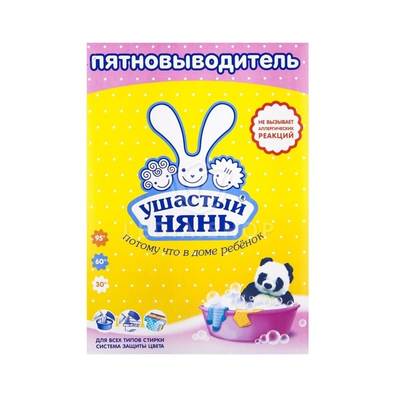 Порошок Пятновыводитель Ушастый Нянь. Сохраняет первоначальный вид. Пятновыводитель разработан для выведения пятен, усиления действия стирального порошка. Пятновыводитель эффективен при низкой температуре воды, что снижает появления эффекта застирывания. Пятновыводитель может использоваться как при стирке вручную, в стиральной машине. Не содержит хлор, красители, отдушки.