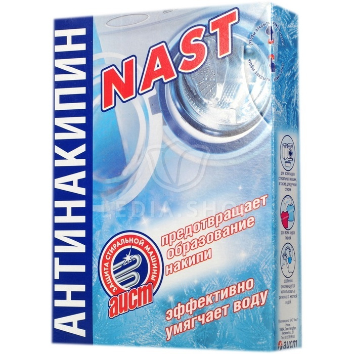 Средство от накипи. Предотвращает образование накипи. Эффективно умягчает воду. Вес упаковки 300г. NAST Антинакипин это современный уровень гигиенического ухода и защиты элементов стиральной машины и белья от накипи, известкового и грязевого налетов, неприятного запаха. Уникальное сочетание различных комплексообразователей предотвращает и растворяет накипь и грязь, смягчают воду, придает мягкость белью после стирки, а также защищают резиновые детали стиральной машины от налипания остаточных загрязнений. Эффективен в широком диапазоне температур: от 15 С до 100 С.
